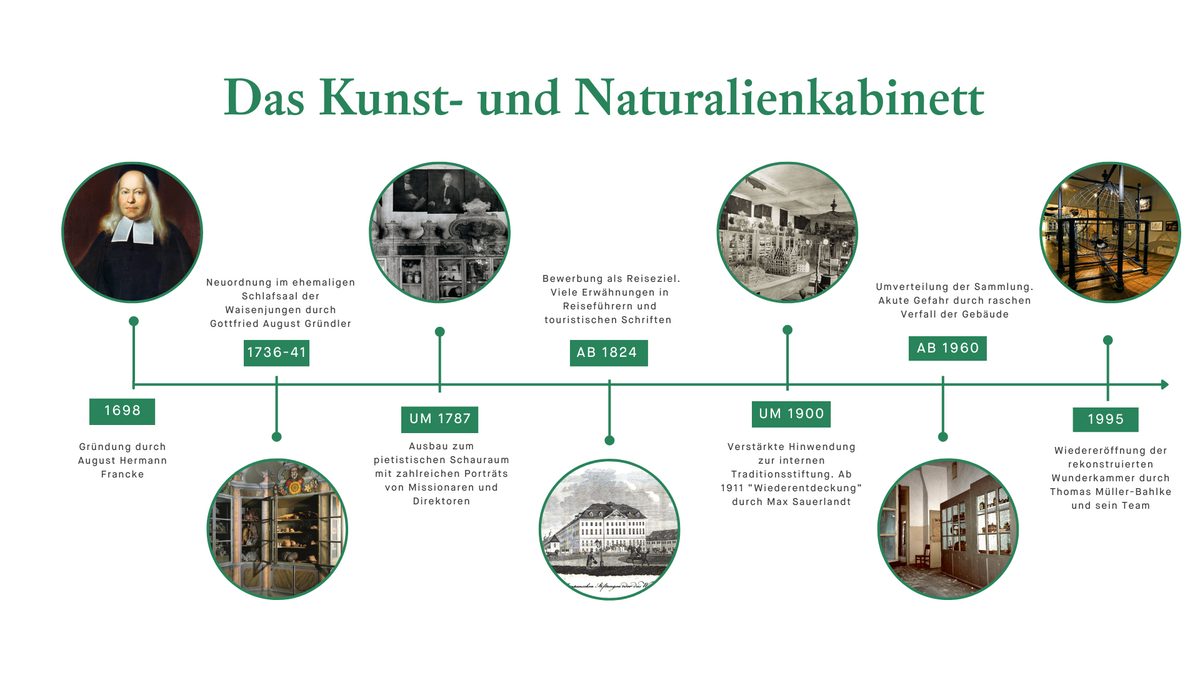 Besucherinnen und Besucher wurden nicht immer mit den Exponaten allein gelassen, sondern durch sogenannte »Herumführer« begleitet. Im August 1741, als die Kunst- und Naturalienkammer nach der Neugestaltung der Öffentlichkeit präsentiert wurde, entstand eine sorgsam ausgearbeitete »Instruktion« für organisierte Führungen. Darin war bis ins Detail festgelegt, wie sich die geschulten Mitarbeiter zu verhalten hatten und welches Bild sie von der Sammlung, dem Gebäude und dem Gelände der Franckeschen Stiftungen anschaulich zu erklären und einzuordnen.